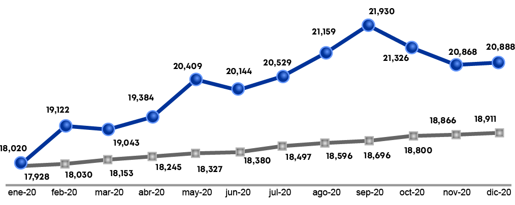 El total de depósitos cerró en 42 701 millones de lempiras, reflejando un incremento del 11.12% con respecto al ejercicio anterior, y reflejando una vez más la confianza y preferencia del público hacia Banpaís. El nivel de adecuación de capital se situó en 14.59%, muy superior al 13% requerido por el regulador. Concluimos el ejercicio 2020 con una utilidad neta de 508.33 millones de lempiras, permitiéndonos alcanzar 10.25% de índice de Rentabilidad sobre el Patrimonio (ROE) y 0.82% de Retorno sobre Activos (ROA).